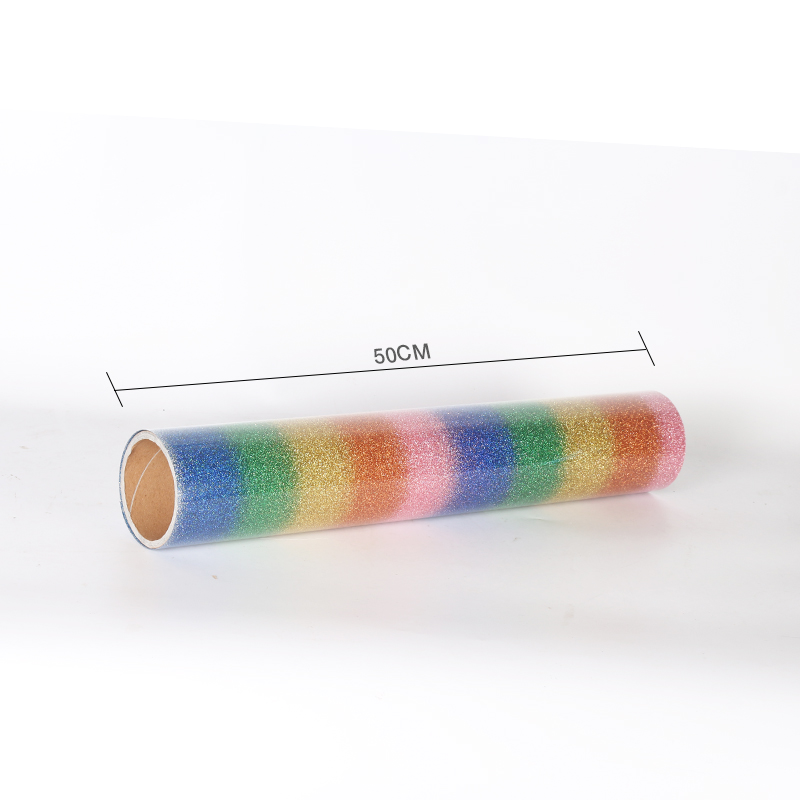 品名:美中国市场热销PU热转印多彩色渐变金葱格利特刻字膜 印花切割葱粉渐变色闪粉刻字膜